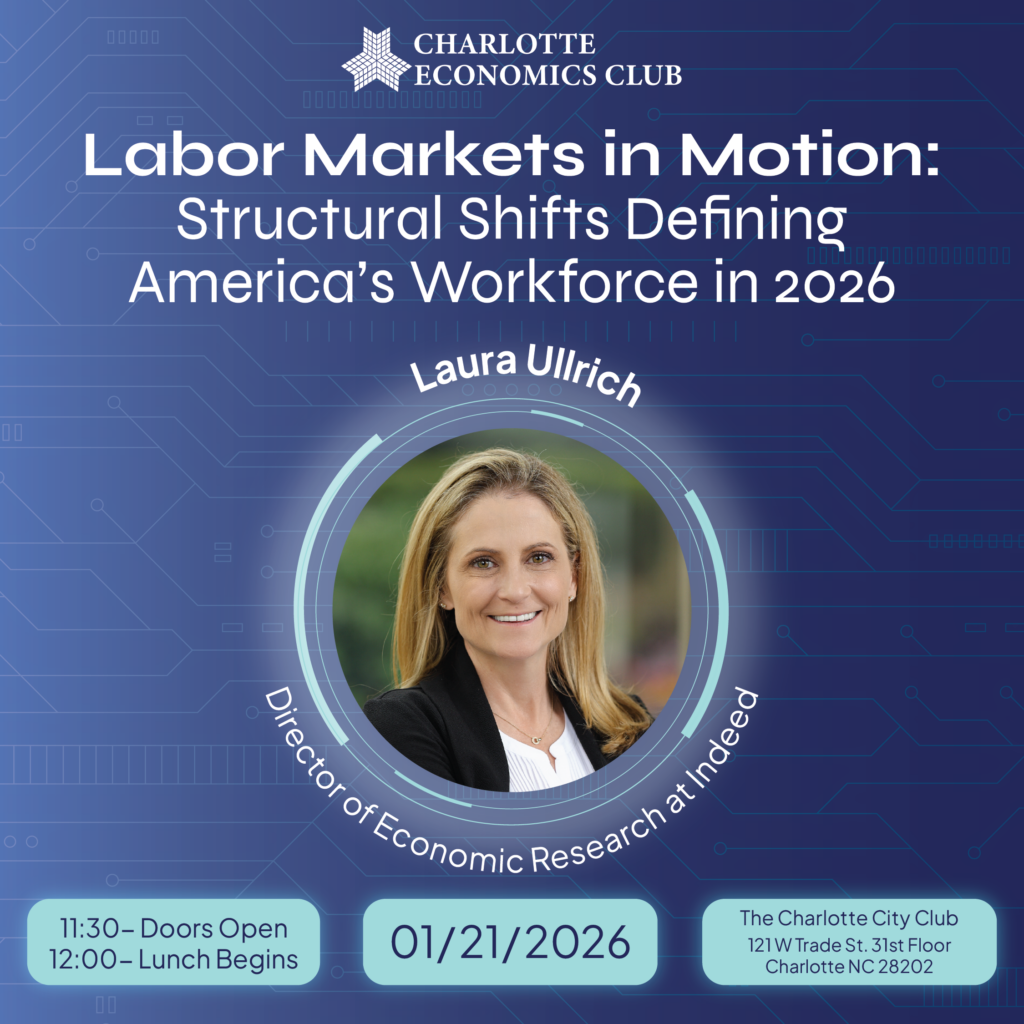 The Charlotte Economics Club is a nonpartisan professional organization dedicated to promoting informed economic discussion and professional development. It serves as a regional forum for leaders in business, government, academia, and finance to explore economic trends and policy issues.